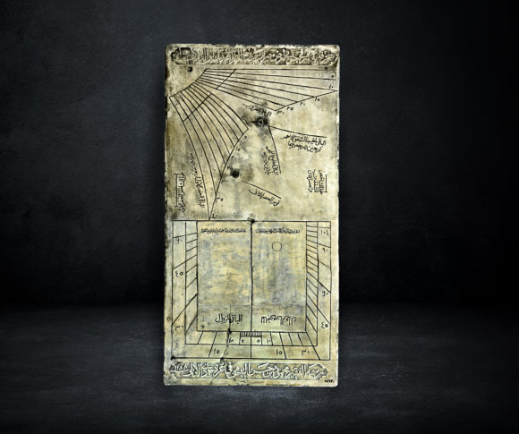 "مزولة شمسية من الحجر الجيري مصر – العصر العثماني القرن 12هـ/ 18م" "تتميز هذه المزولة بوجود نقشين كتابيين في أعلاها وأسفلها، تضمن النقش الأول اسم محمد بك ابو الدهب وهو الوالي الذي أمر بصناعتها،أما النقش الثاني فيشتمل على اسم الصانع وتاريخ الصناعة، ونصه ”رسمه الفقير محمود بن حسن النيشى في غرة جمادى الأولى سنة 1188“.