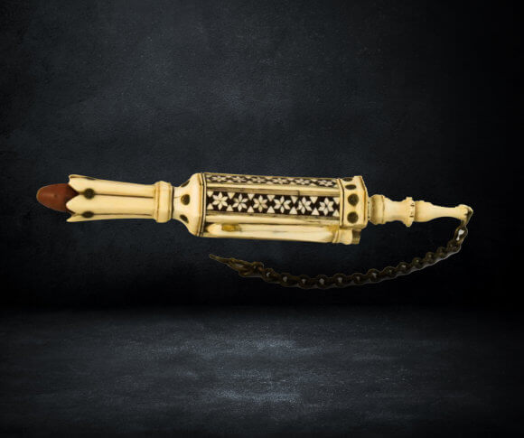 " مكحلة من العاج المطعم بالصدف مصر- العصر المملوكي أو العثماني القرن 9-10هـ /15-16م" "جَعل الإسلام النظافة والهيئة الحسنة وجمال المظهر جزءًا من الإيمان, وكان هذا باعثًا على انتشار أدوات الزينة في الفنون الإسلامية, ومنها مرشات العطر والمكاحل والأمشاط والمرايا.