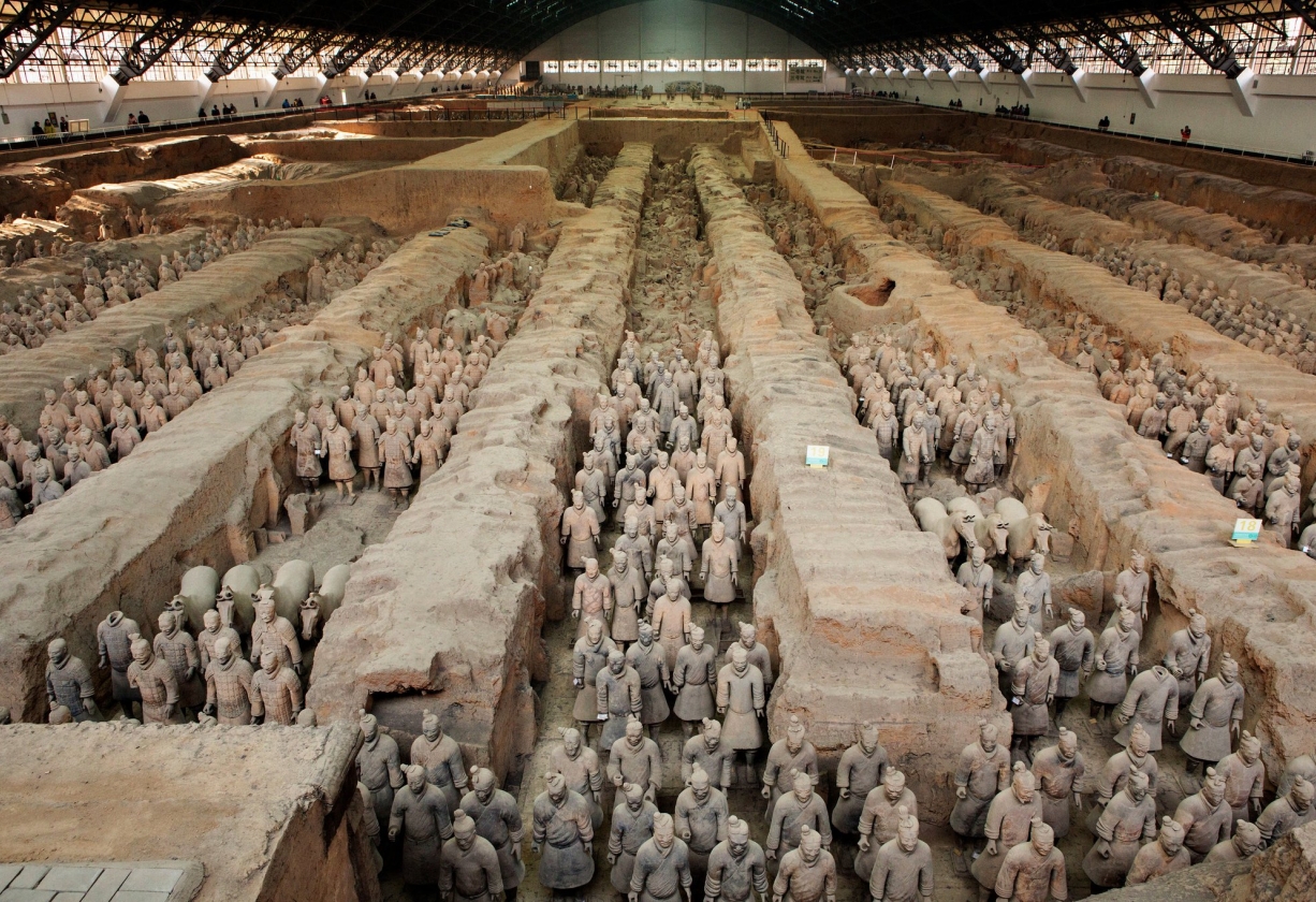 جيش الطين - هذه مجموعة من منحوتات التراكوتا التي تصور جيوش تشين شي هوانغ ، الإمبراطور الأول للصين. تم دفن الجيش مع الإمبراطور في 210-209 قبل الميلاد وأعيد اكتشافه في عام 1974 من قبل المزارعين الذين كانوا يحفرون بئرًا. الأشكال بالحجم الطبيعي وتختلف في الطول والزي الرسمي وتسريحة الشعر ، مما يشير إلى أنها صُنعت لتمثيل جنود حقيقيين.