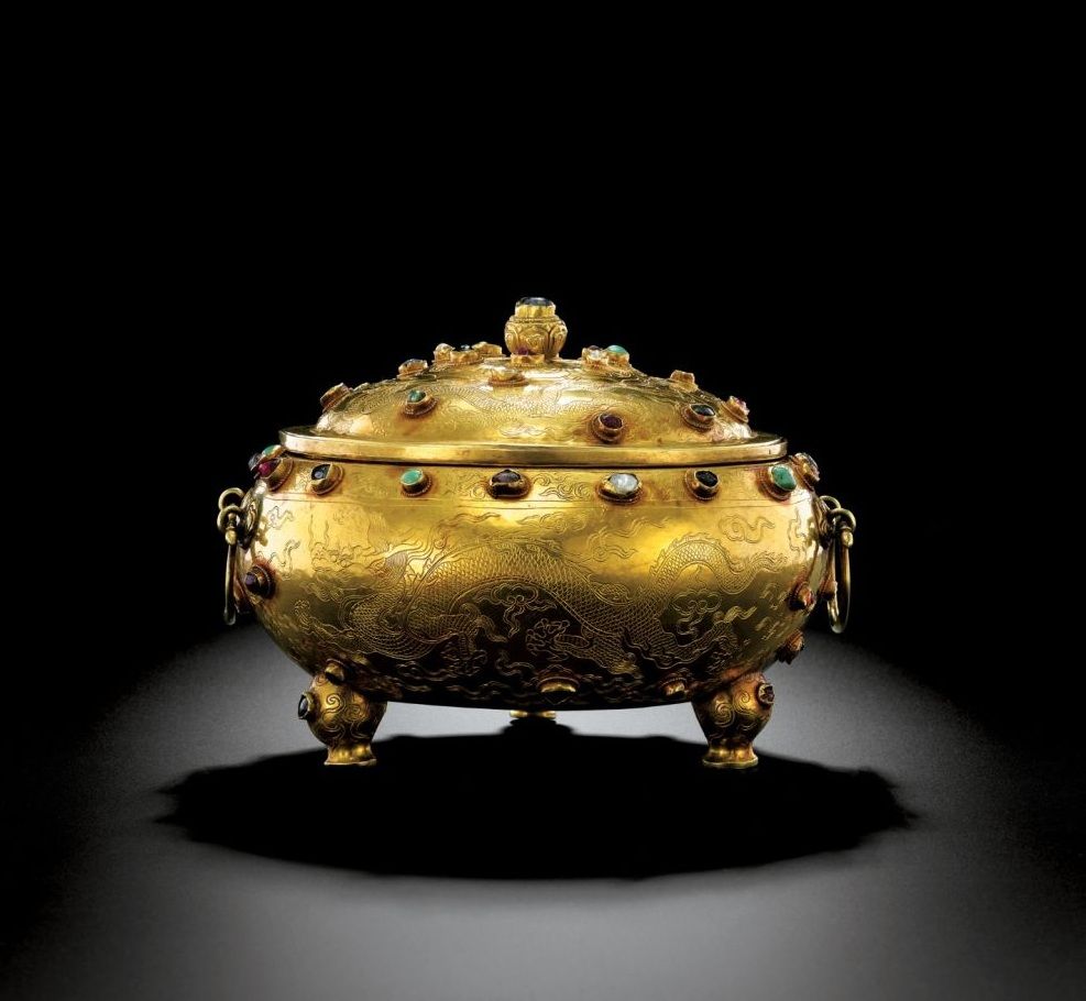 تحفة Ming Dynasty Gold Tripod Vessel إنها قطعة فنية صينية رائعة مصنوعة من الذهب الخالص إنها يتميز بوجود تنينين عليها ولها ثلاثة أرجل ومطعمة باللآلئ ، تم بيعها في أبريل 2008م في مزاد بمبلغ 14.232.241 دولار.