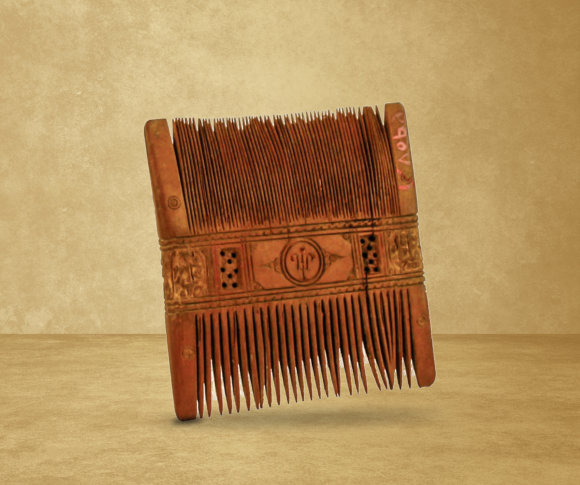 مشط من الخشب مصر - العصر المملوكي القرن 8 - 9هـ/ 14- 15م. "تُعد الأمشاط من أهم أدوات الزينة فمن خلالها يستطيع الإنسان تسريح شعر الرأس واللحية حتى يظهر بالشكل اللائق، ولكل مشط أسنان مزدوجة، وتزدان المنطقة المحصورة بين الأسنان بشتى أنواع الزخارف.