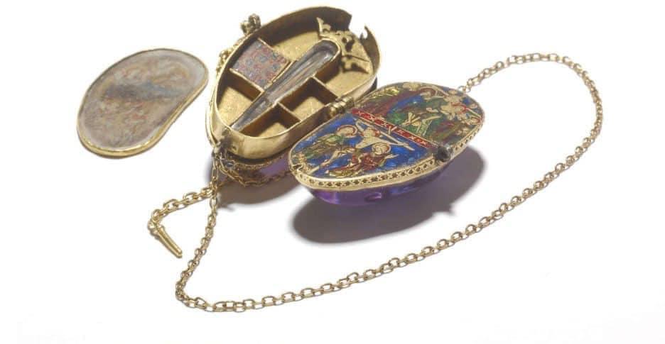 قلادة ريلكفاريج مع المسمار المقدس، حوالي 1340، فرنسا. ذهب، ورد، مينا، جمشت، كريستال. المتحف البريطاني